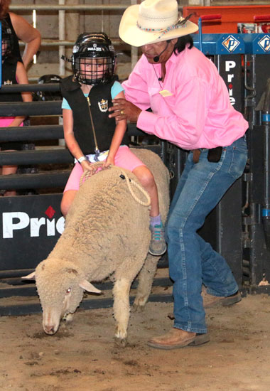 Autumn Yadon, 6, gets a steady start from Frank Rendon, Wool Busters event organizer, at the Josephine County Fair Wednesday. Yadon got a blue ribbon for her efforts. "We want to caputre kids' interest in the sport of rodeo," Frank Rendon, event organizer says. "We're looking for the next rodeo champ."