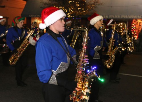 The Grants Pass High School Marching Band & Color Guard entertained thousands of people that lined both sides of Sixth Street Saturday at the Grants Pass Christmas Parade Saturday. This year's theme was The Magic of Christmas" and featured 42 entries including other school marching bands, a Hellgate Excursions jetboat, fire engines, a logging truck with thousands of lights and culminated with Santa Claus atop a rooftop.